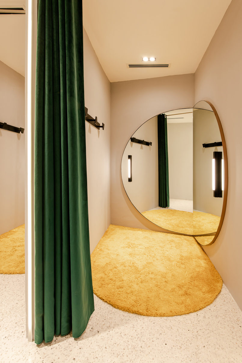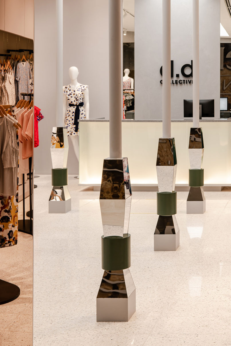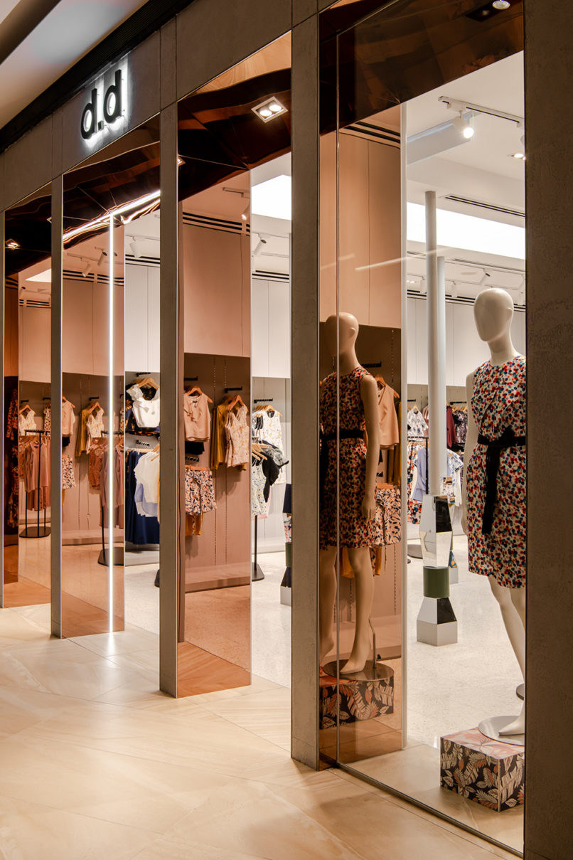 The retail space for d.d Collective, a local contemporary womenswear brand was envisioned as a “Modern Monolith.” The clothing caters for strong, ambitious women who is unashamed of flaunting their softer, demure side. Taking cue from the brand’s muse, the façade gives the impression of walking into a grand temple, softened with mirror-finished copper lining that serves both as an entrance and window display. The internal layout of the space revolves around a linear “courtyard” with ornamented mirror pilotis. To accentuate the diverse prints and colors in the products, the product display shelves are kept muted in grey against the movable curved clothing rails. One’s eye is immediately drawn to the symmetry of the space and the counter at the end of the courtyard, revealing behind a discreet and curtain-screened changing room nook.