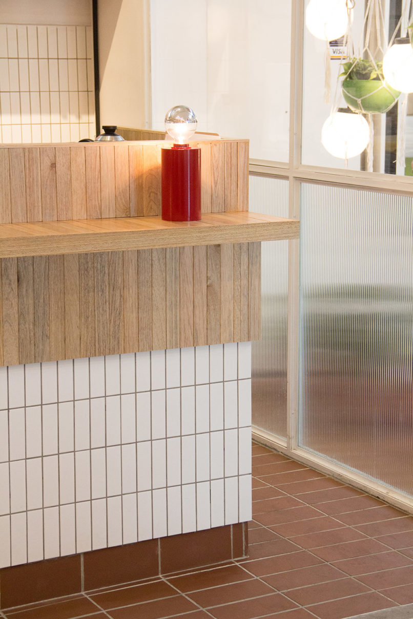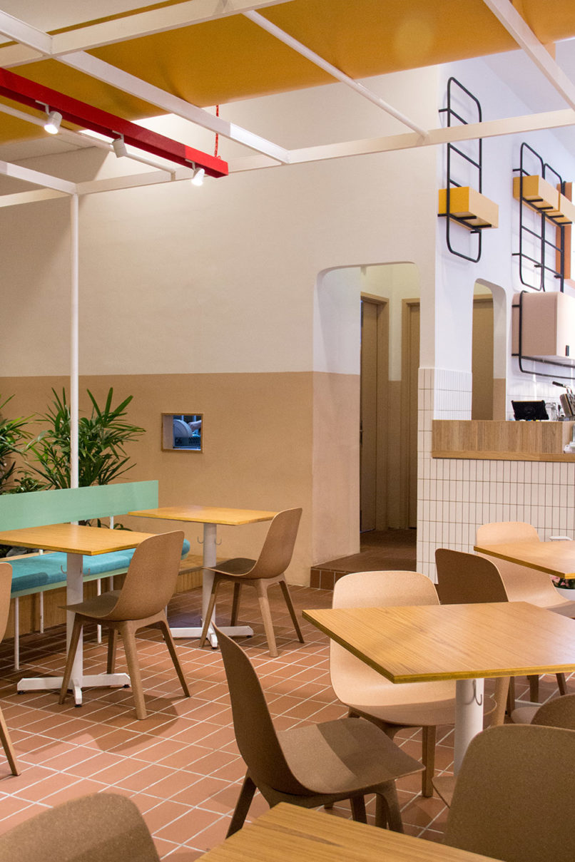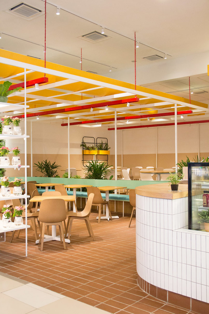 Located inside a mall, the restaurant & café is a collaboration between The Owls, a popular waffle parlour with Midorie, an indoor planting concept from Japan. The brief called for a space that showcases its innovative indoor planting system that also negotiates a café bar and dining area for the parlour. Envisioned as a indoor green house, a delicate steel frame supports three semi-circle neon orange planter boxes that would house indoor plants. Suspended through the frames are rows of red linear strips serving as track lighting for the dining and indoor plants below. Terracotta floor tiles accentuate the white rectangular tiles that clad both the back bar and curved bar counter. Modular steel frames with small planter boxes are placed throughout the space – showcasing the potential of the planting system in homes and compact spaces.
