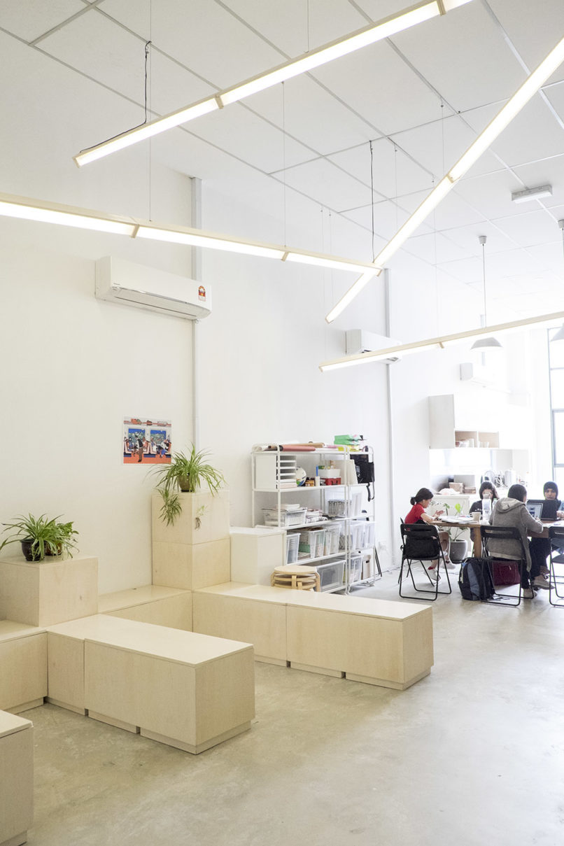 The project calls for a new retail, office and production hub for Mossery, a young and vibrant homegrown stationary brand. Situated in a modern factory space with high ceiling, the challenge was to humanize each space to better appreciate the finesse and scale of the products while providing adequate efficiency and organization for the production and office department. The high frontage is broken down in to more intimate side entry below a ‘floating’ strip of greens – giving ample window display for its products. A movable meeting cube and a high PVC curtain wall create zoning while maintaining permeability. A series of distorted light strips and modular plywood cube seating define a communal space for events and pow-wow sessions for the brand.