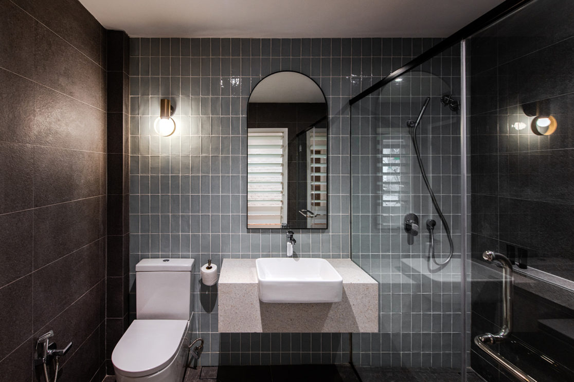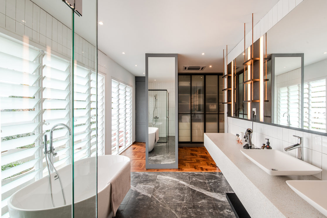 Situated in the sleepy neighbourhood of Section 17 in PJ, the house is designed for a young couple. Sitting on a slope, one enters the existing house from the upstairs into a lofty double-volume kitchen, dining and living area. The open kitchen concept revolves around an irregular-shaped stone counter island with hints of grey and copper as a homage to the wife who is a coffee connoisseur. A raised timber platform with a custom wireframe chandelier separates the dining and living area, with both spaces overlooking a balcony with a view. The original stairwell is taken apart to allow more daylighting into both levels and is replaced with an angular timber and steel staircase that floats above a cluster of planter-boxes. The bedrooms and family room are located downstairs for more privacy but at the same time facing towards slithers of light and pocket garden spaces.
