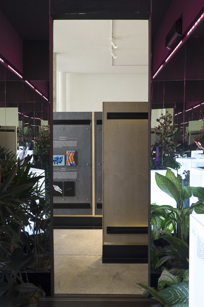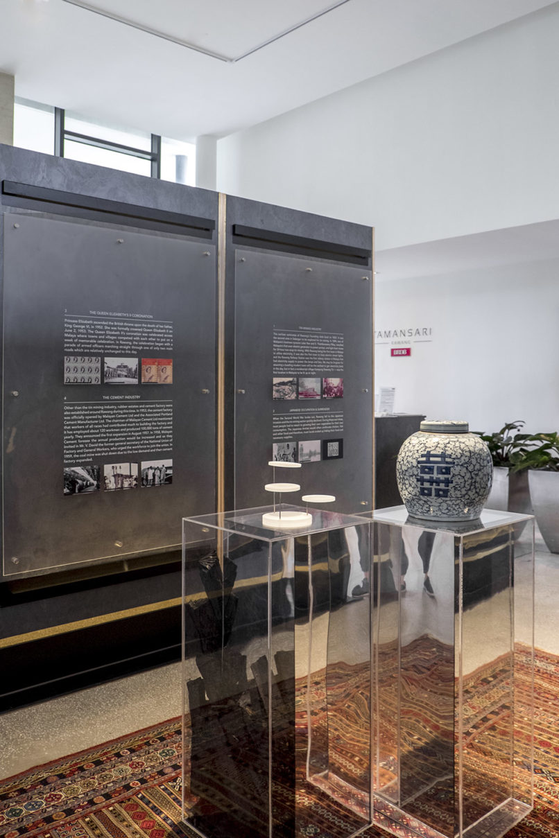 The brief was to transform an existing property showroom of a local developer into a series of mini experiential installations that celebrate the origins of Rawang, a former mining town. Revolving around the narrative of “Past-Present-Future,” the space is comprised of three parts – story planes, charcoal modules and an infinity mirror park. The story planes narrates the history of Rawang through text and multimedia against natural stone cladding while the charcoal modules are charcoal encased in clear acrylic cubes, creating a man-made landscape to display property models of the development. The journey ends in the infinity room where a small existing meeting room is transformed into a never-ending space with indoor landscaping and also UV lighting, while housing four marquettes of the new sculptures that will soon adorn the Art Park, a highlight of the development.