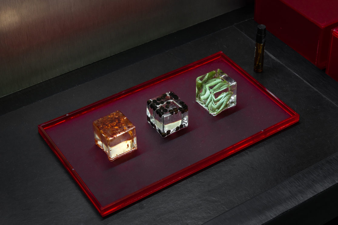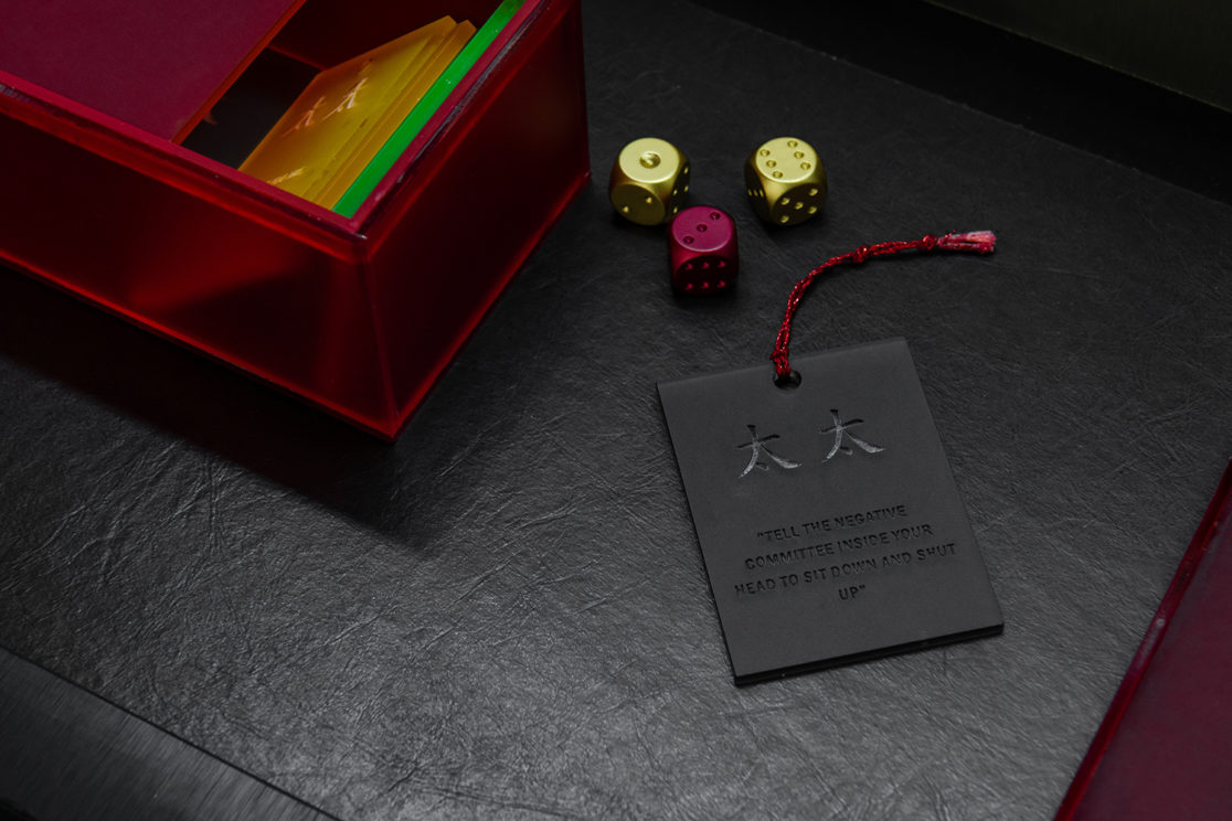 Taking cues from the original Gerai Tai Tai installation, the newer version takes on a larger, more refined form with Lamitak laminate finishes to mimic a futuristic pixelated exterior and a stark gold interior. The installation was fabricated completely in Malaysia and designed to be flat-packed and re-assembled in Venice. Due to food security, edible items were not allowed as part of the experience as per the original setup but was improvised with spray scents made from local Malaysian ingredients. Each ingredient is also cast in clear resin to re-create the “stained-glass” wall that separates the participant with the fortune teller. Readings are done using dices and a scent carefully selected by the fortune teller for the participant. Each participant is then given a custom lasercut acrylic amulet as a good-luck charm.